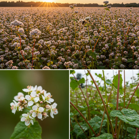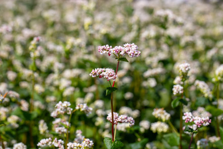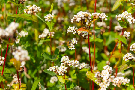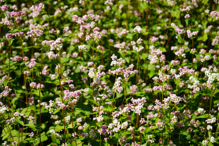 Field of flowering buckwheat (Fagopyrum esculentum),close-up. Botanical collection of edible plants
