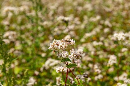 Buckwheat (Fagopyrum esculentum) flower in cultivated field, selective focus