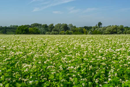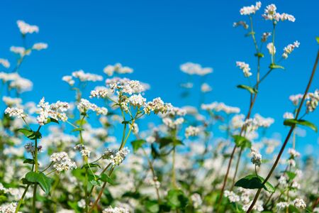 A field of buckwheat blossoms against the blue sky. Agriculture, landscape.