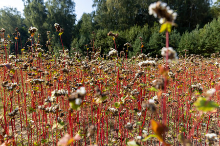 The flower garden of buckwheat noodles. Buckwheat plants with flowers almost ready to be harvested. Agriculture. Farming.