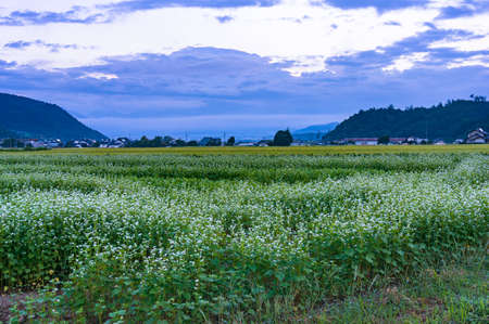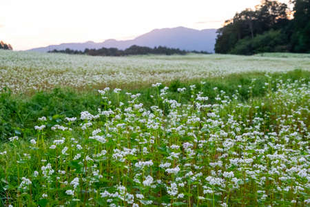 Buckwheat field on dusk with mountain view. Flowering buckwheat farmland. Buckwheat is main ingredient for traditional Japanese soba noodles