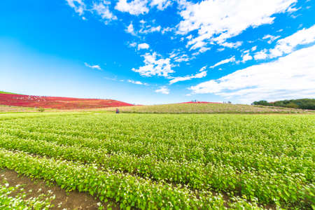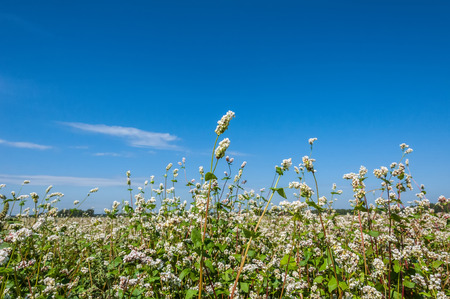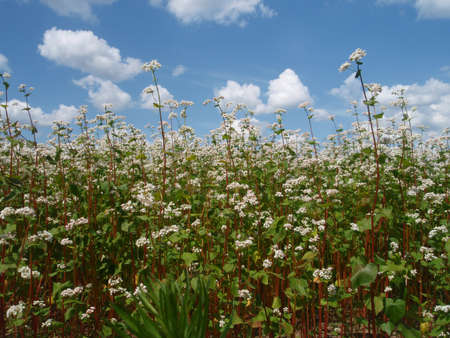 Buckwheat blossom field with blue sky and clouds. Landscape orientation