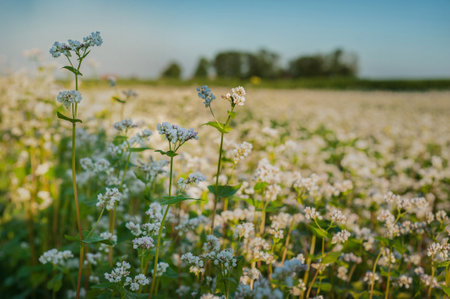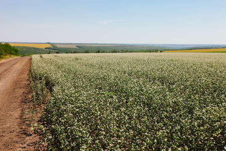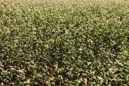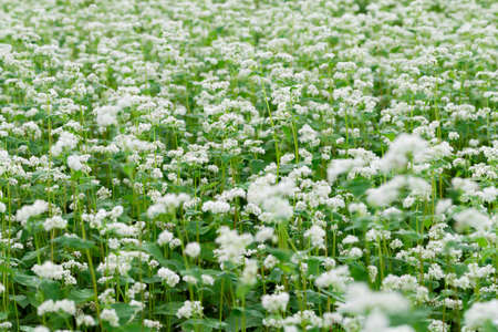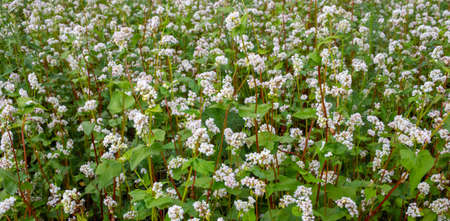 Many beautiful buckwheat flowers growing in the field. Agriculture scene.