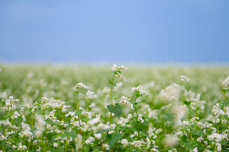 blooming buckwheat and blue sky background. Buckwheat field during flowering. Growing buckwheat in the farm.