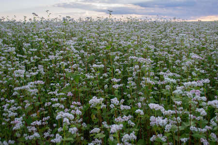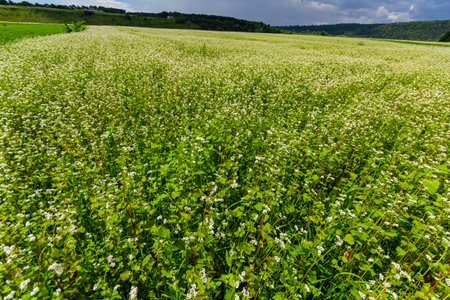 Agricultural field with blooming buckwheat in cloudy weather, cultivation of buckwheat for food production in Eastern Europe