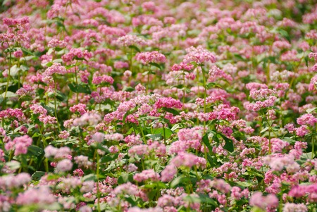 Detailed close up view of delicate pink and white buckwheat flowers in a green field