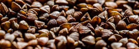 Organic buckwheat groats macro background. Roasted dry buckwheat grains texture close-up. Wholegrain buckwheat seeds for gluten free diet, vegetarian food and dietary fiber concepts. full frame.
