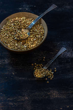 Organic buckwheat in a vintage bowl with spoon on dark rustic table