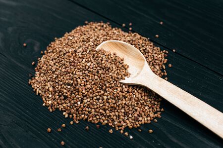 raw buckwheat grain on a wooden spoon on wood table background. selective focus