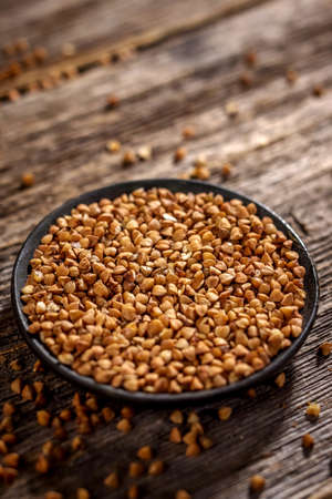 Buckwheat groats on wooden background, top view, close-up, selective focus. Some copy space for your text. Premium cereal for healthy eating or dieting. Healthy food concept.