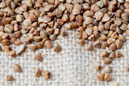 buckwheat. fresh buckwheat. dry buckwheat background. buckwheat on sacking, empty space.