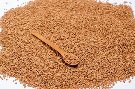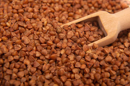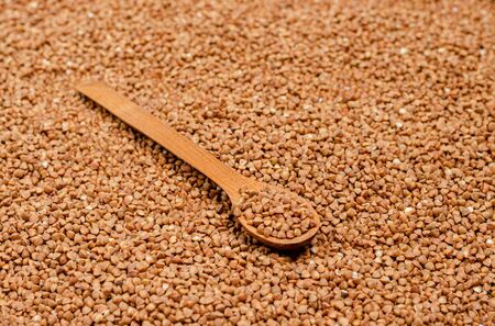 Dry groats for vegans in a wooden spoon on a background of buckwheat. Healthy foods high in protein and carbohydrates. View from above. Horizontal orientation.