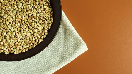 Raw green buckwheat in a brown clay plate on a brown background. Vegan organic food concept. The concept of diet, weight loss, healthy and proper nutrition. Copy space for text. Top view, flat lay.