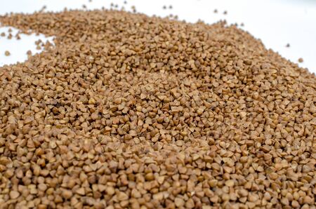 Close-up of buckwheat grain pile. Buckwheat groats.