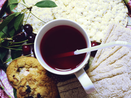 Composition with cup of rowan tea and cookies on light wooden background, closeup