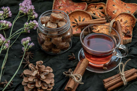 Hot bael fruit tea with bark of bael fruit and brown cane sugar cube. The properties of hot bael fruit juice is a kind of herb - The concept of health. Drinks & Beverages, Selective Focus.