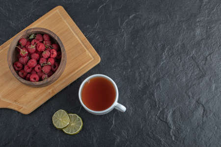 Warm tea with lemon and cookies served with fresh strawberries on a dark surface