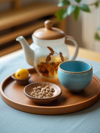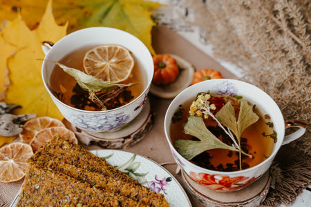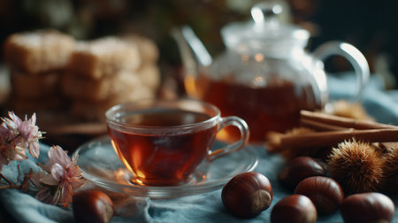 Warm tea served with spices and chestnuts on a cozy table setting for a relaxing afternoon