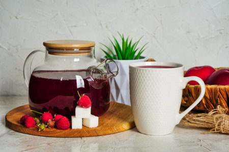 Raspberry tea in a transparent teapot with berries and sugar cubes, cup of tea