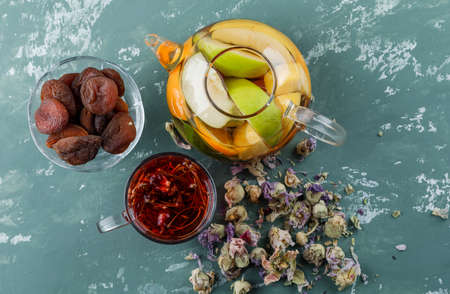 Fruit infused water in a teapot with dried apricots, herbs, herbal tea top view on a plaster background