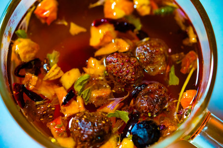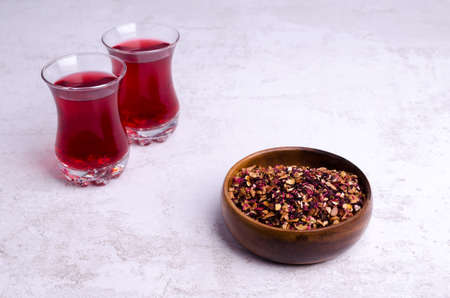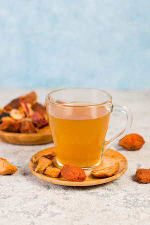 Glass of freshly brewed fruit and herbal tea. Darker background.