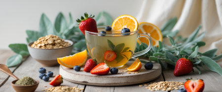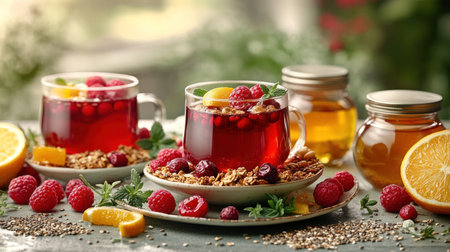 AI Generated. Refreshing Herbal Tea with Fresh Fruits and Granola on a Table