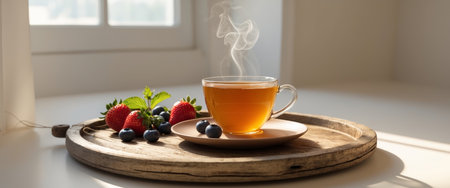 AI Generated. Warm tea placed on a wooden tray with fresh berries and mint by the window in a sunny room