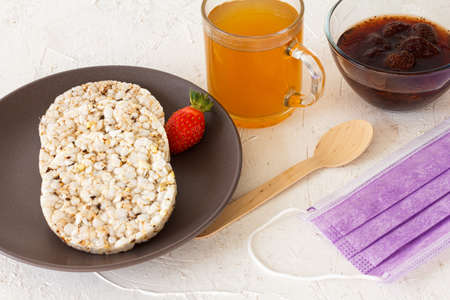 Puffed rice cakes, a strawberry on the plate, a cup of tea, glass bowl with jam and a medical protective mask on the white structured background.