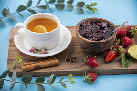 top view of strawberry jam on a wooden bowl on a wooden kitchen board with a cup of tea with cinnamon