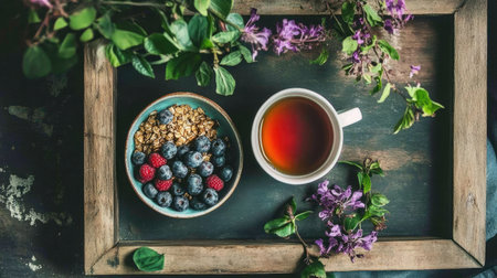 A rustic breakfast scene featuring a bowl of yogurt, granola, mixed berries, and a cup of herbal tea, arranged on a wooden tray.