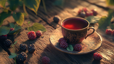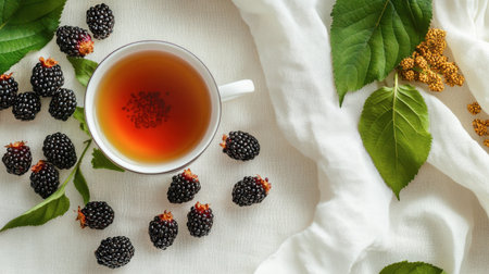 A serene setting featuring a cup of herbal tea surrounded by fresh blackberries, green leaves, and soft linens, creating a cozy and inviting atmosphere.