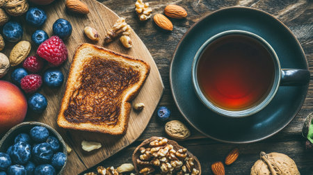A vibrant breakfast scene featuring a warm slice of toast, a variety of fresh berries, nuts, and a steaming cup of tea, perfect for a healthy morning routine.