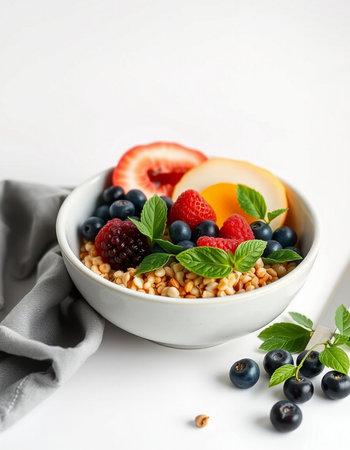 A healthy breakfast setting featuring herbal tea, fresh fruits, and nutritious seeds on a light grey background.
