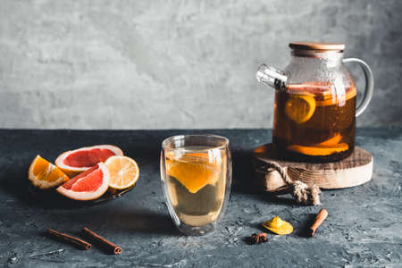Citrus tea in a transparent teapot on a gray concrete background. Healthy drink, vegan, eco product.