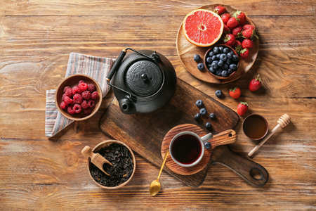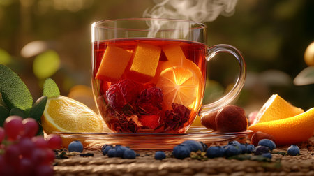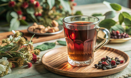 A beautifully styled cup of herbal tea sits on a rustic wooden table with fresh berries surrounding it, creating a cozy and inviting atmosphere.