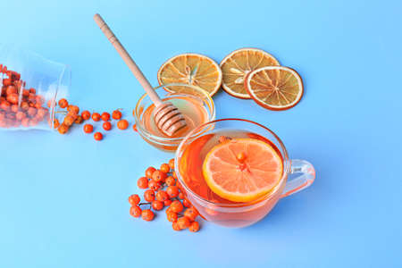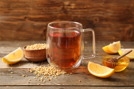 Glass cup of hot buckwheat tea with lemon and bowl of honey on wooden background
