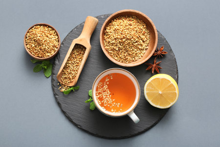 Cup of hot buckwheat tea with lemon and bowl of honey on gray background