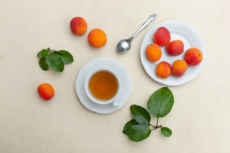 Food background with white porcelain cup of tea, lemon, ripe plums and nectarines, walnuts and white marshmallows on wooden background. Horizontal orientation, selective focus, top view, copy space