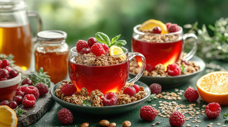 Bright cups of fragrant tea, granola, and fresh raspberries adorn a serene garden.