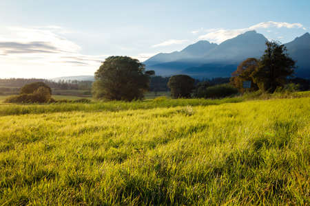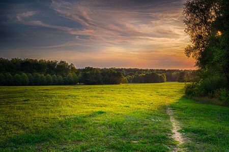 Colorful landscape with field and trees.Summer landscape with green grass and clouds..
