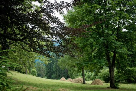 Several haystacks in a beautiful green environment, Maramures, Romania