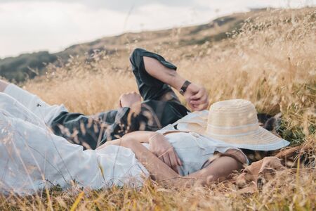 Young couple man and woman in love on the field on the mountain in autumn or summer day laying lay on the ground together having fun bonding holding hands husband and wife lovers