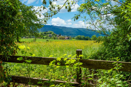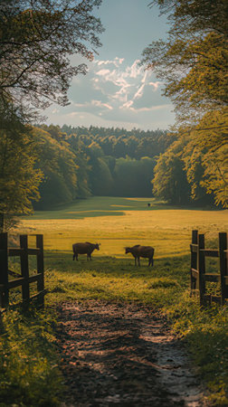 A stunning rural landscape with lush fields, meadows, charming farms, grazing livestock, and rustic rural houses set against a serene countryside backdrop.