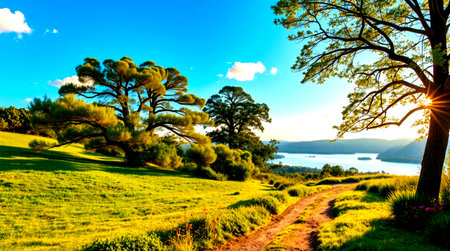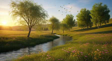Generative AI : Beautiful panoramic background image of the countryside with a slowly flowing stream and dense thickets of bushes along the banks against the backdrop of a pictures