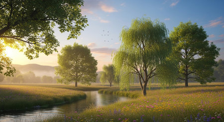 Beautiful spring landscape with river and trees at sunset. 3d render