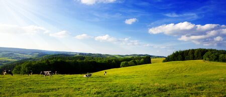 beauty of dairy farming with a panoramic view of cows grazing in a lush farm pasture