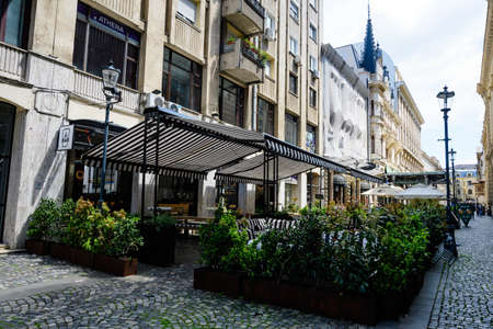 BUCHAREST, ROMANIA - AUGUST 17, 2021: Typical street and buiding at downtown (old town) of city of Bucharest, Romania