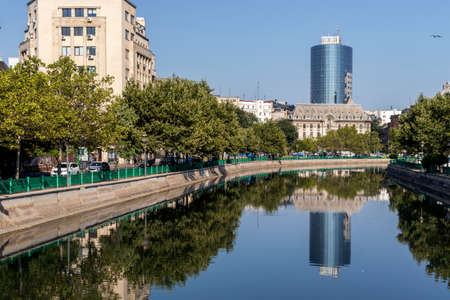 BUCHAREST, ROMANIA - AUGUST 16, 2021: Dambovita River passing through the center of city of Bucharest, Romania