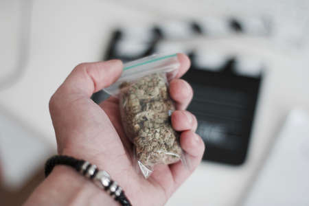 Green dry marijuana in man hand on the blurry background. Weed concept.