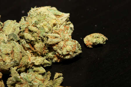 Marijuana buds closeup. Medicinal cannabis flowering on black background. Hemp recreation, medical usage, legalization.